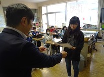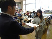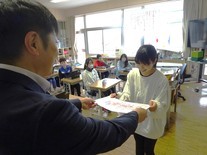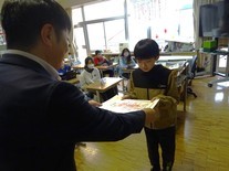 先日、茶内地区健全育成標語・イラストの表彰をしました。最優秀賞と優秀賞を受賞した子供たちの教室へ行き、ミニ表彰式を行い、賞状を渡しました。