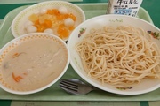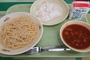 今日の給食は、「スパゲッティ・トマトソース」「フルーツのヨーグルトクリームあえ」「牛乳」でした。トマトソースは程よい酸味と甘みが絶妙でとってもおいしいですよ!