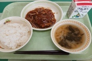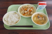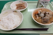 今日の給食は、「ごはん」「みそ汁」「つくねと里芋の甘辛煮」「のり酢あえ」「牛乳」でした。つくねと里芋の甘辛煮ですが、柔らかい触感の中に旨みがいっぱい含まれていて、とてもおいしかったです。