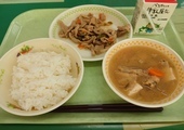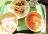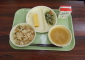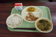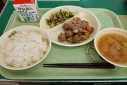 今日の給食は、「ごはん」「みそ汁」「ザンギ」「ナムル」「牛乳」です。みんな大好きなザンギ。子どもたちはとても喜んで食べていました。