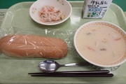 今日の給食は、「黒糖ロール」「クリームシチュー」「豚しゃぶサラダ」「牛乳」でした。クリームシチューは具沢山でとてもおいしかったです。