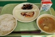 今日の給食は、「ごはん」「豚汁」「たらの変わりみそ焼き」「五目ひじき」「牛乳」でした。たらは散布産で、低脂質・高たんぱくな食材です。たらのみそ焼き、焼いた味噌の香ばしさも相まってとてもおいしかったです。