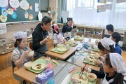 今日は訪問給食が行われました。職員室や他の学年の先生方が一緒に給食を食べ、交流を深める取組で年数回行われます。写真はその様子です。