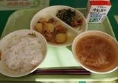 今日の給食は、「ごはん」「みそ汁」「つくねと里芋の甘辛煮」「ごまあえ」「牛乳」です。つくねと里芋の相性がとてもよく、甘辛煮をおいしくいただきました。