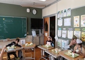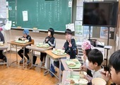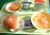 1年生にとって初めての給食でした。みんなおいしそうに、笑顔でいっぱい食べていましたよ。
