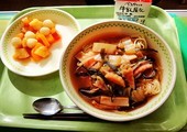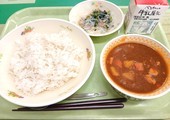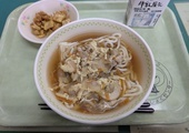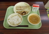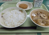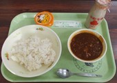 今日のは、「ホイコーロー丼」「みそ汁」「りんご」「牛乳」でした。ホイコーロー丼はホイコーローをご飯に載せて食べます。味も濃い目で、丼物として食が進みます。ボリュームもあって大満足です。