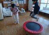 中休みに子どもたちの様子を見に回っていると、1階のホールでは低学年の子どもたちがぽっくりやトランポリンで楽しそうに遊んでいる様子がありました。体育館からも声がしたので足を運ぶと、異学年でリレーを楽しんでいました。冬期間に入りグラウンドで遊べませんが、子どもたちは校内で元気に遊んでいましたよ。