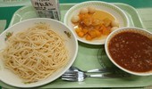 今日の給食は、「スパゲティ・ミートソース」「フルーツポンチ」「牛乳」でした。ミートソースはミートがいっぱい入っていて食べ応えがあります。おすすめのメニューの1つですね。