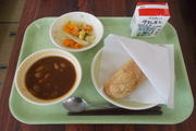 今日の給食は、「黒糖ロール」「キャベツとウインナーのスープ」「チリコンカン」「りんごのシロップ漬け」「牛乳」でした。チリコンカンとは、ひき肉・トマト・豆などを煮こんだメキシコ料理です。今日の牛乳は、浜中のおいしい牛乳でした。