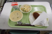 今日の給食は、「キャベツナペーストサンド」「さつま芋のクリーム煮」「牛乳」でした。クリーム煮は、さつま芋の甘みが効いててとてもおいしかったですよ。