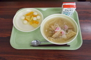 今日の給食は、「コーン入り塩ラーメン」「フルーツと白玉のマスカットゼリーあえ」「牛乳」でした。最近、朝晩の冷え込みが厳しくなり、ストーブをつけたご家庭も多いのではないでしょうか?寒いときにラーメンを食べると、心も体も温まりますね。