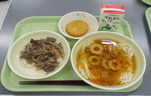 今日の給食は、「あぶたまうどん」「焼きおにぎり」「牛乳」です。私は給食で初めて焼きおにぎりを食べましたが、とても香ばしくておいしかったです。