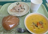 今日の給食は、「シーフードピラフ」「ポトフ風スープ」「かぼちゃひき肉フライ」「牛乳」でした。ピラフもスープもボリュームがありとてもおいしかったです。