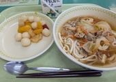 今日の給食は、「カレーうどん」「フルーツと白玉のピーチゼリーあえ」「牛乳」でした。給食だよりによると、カレーうどんは明治時代に東京のお蕎麦屋さんで誕生したそうです。結構歴史があるんですね。