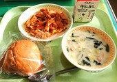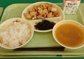 今日の給食は、「ごはん」「みそ汁」「ザンギ」「ナムル」「牛乳」です。みんな大好きなザンギ。子どもたちはとても喜んで食べていました。