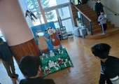 1階のホールに食育コーナーができました。ロボットが置かれていてお悩み改善のためのおすすめ食材が出てきたり、ホワイトボードに掲示物が貼られるなど様々な工夫がされています。休み時間、ロボットの周りに子どもが集まっていました。