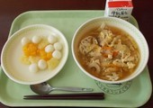 今日の給食は、「カレーうどん」「フルーツと白玉のピーチゼリーあえ」「牛乳」でした。給食だよりによると、カレーうどんは明治時代に東京のお蕎麦屋さんで誕生したそうです。結構歴史があるんですね。