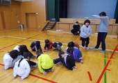今日は縦割り班競技の全体練習の日でした。4チームに分かれ、高学年と低学年に分かれて競技をします。チームごとにペアや走順も含めて作戦を立てるところが肝となります。各チーム、いろいろと工夫していました。