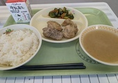 今日の給食は、「ごはん」「みそ汁」「つくねと里芋の甘辛煮」「ごまあえ」「牛乳」です。つくねと里芋の相性がとてもよく、甘辛煮をおいしくいただきました。