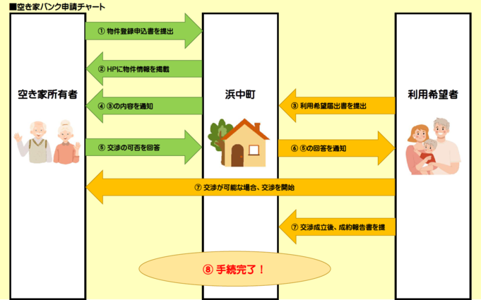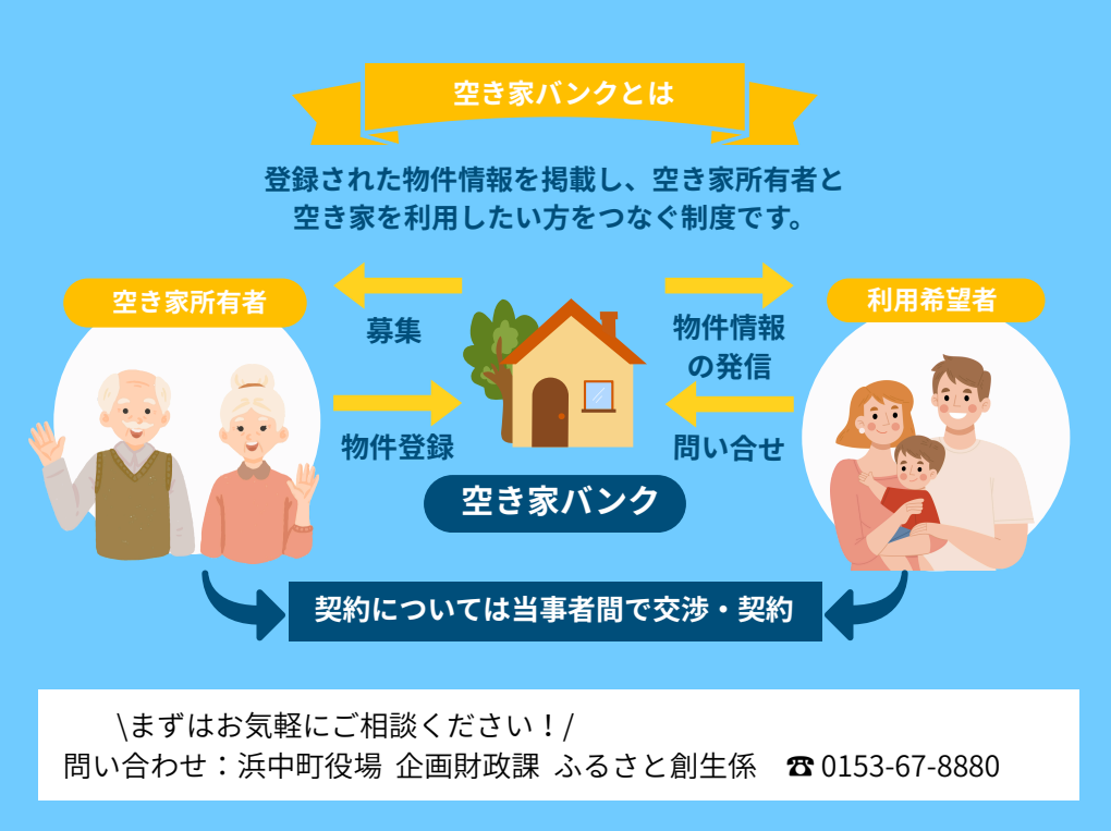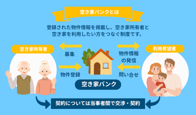 町が、町内の空き家等の所有者から情報を集め、空き家の購入等を希望する方に対し情報提供を行う制度です。